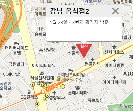 특히나 빨간 세모의 확진자 방문 표시를 클릭하면, 몇번째 확진자가 몇시에 방문한 어느 장소인지 확인할 수 있다. 신사역 근처의 확진자 방문지를 클릭해보면, 1월 23일에 3번째 확진자가 방문한 강남 음식점2임을 알 수 있다.