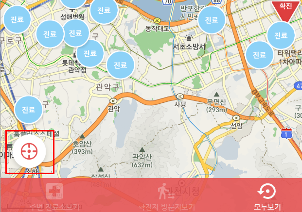 그리고 내 위치에서 (위에서 확인한) '주변 진료소 보기'와 '확진자 방문지보기'를 사용하면 좀 더 효율적인 사용이 가능하겠다. 그나저나 사회초년생, 공시생 등의 밀집구역 신림, 서울대입구역, 낙성대역 등 관악구는 그나마 클린해보인다.