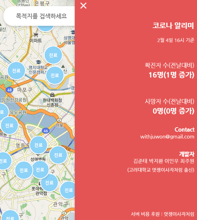 게다가 코로나 사태 이전에 메르스가 국내를 휩쓸고 지나갈 때 나왔던 '메르스맵'도 멋쟁이사자처럼 출신 교육생들이 만들었다고 알고있다. 대학생들이 서버 비용이 감당이 안될텐데, 사이트를 살펴보니 멋쟁이사자처럼이 서버 비용을 후원한다고 한다.