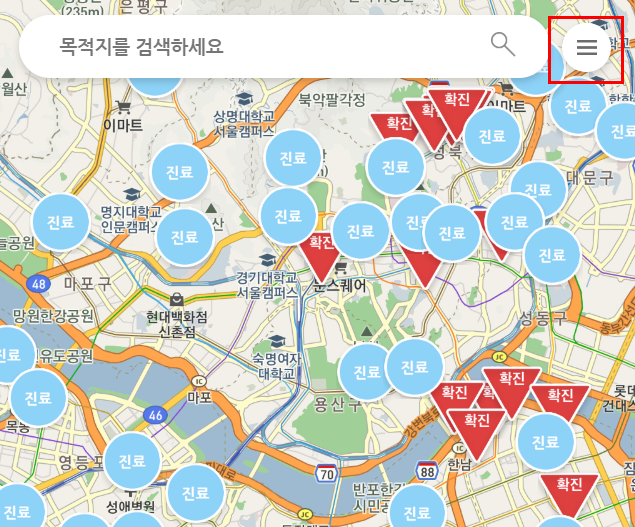 내 위치 허용 후, 내 근처 확진자 방문지역과 진료소 확인! 내 목적지 근처로 확인! 사이드 메뉴에서 확진자수 현황 확인!