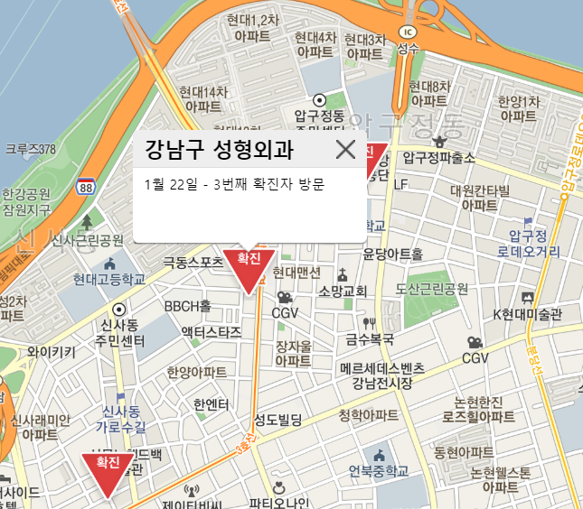 언론에 떠들썩했던 강남구의 성형외과도 확인해볼 수 있다. 1월 22일에 3번째 확진자가 방문했다.