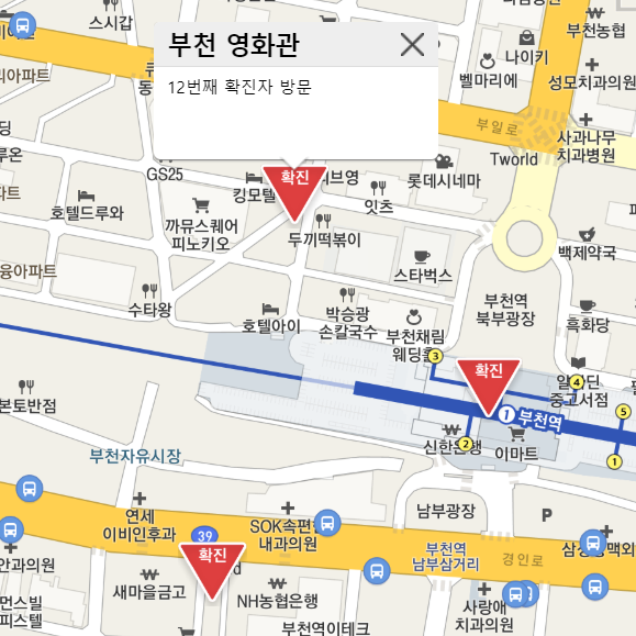 좀더 확인을 해보면 부부라고 알려진 12, 14번째 확진자의 주거지, 부천역 주변에 3가지 방문 장소를 확인할 수 있다. 위에서부터 차례대로 부천 영화관, 마트, 음식점이다(부천 쇼크가 일어났다고 하네요ㅠㅠ).