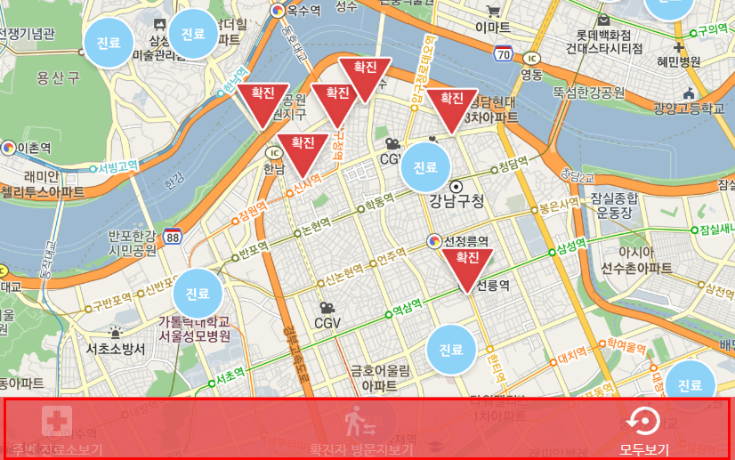 페이지 하단을 보면, 주변 진료소와 확진자 방문지를 클릭해서 확인할 수 있다. 내가 자주가는 강남역인데 주변에 코로나 확진자 방문지가 밀집해있다.