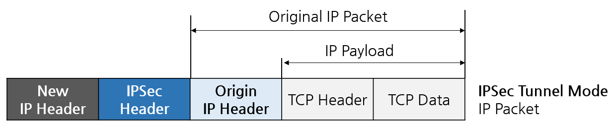 전송 모드와는 달리 터널 모드는 IP 패킷 전체를 보호한다. 아래 그림을 보면, 위에서 살펴본 전송 모드와 패킷 구성이 어떻게 다른지 한눈에 알 수 있다. 터널 모드에서는 IPSec 헤더가 IP 패킷 전체인 IP 헤더 + IP 페이로드 앞에 위치해있다. 게다가 새로운 IP 헤더가 IPSec 헤더 앞에 추가되어 있다.