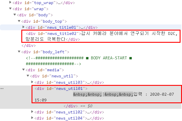 그럼 이제 마지막 단계이다. 뉴스 기사의 제목, 날짜, 본문에 접근해서 내용을 긁어오자. 먼저 제목과 날짜는 각각 div 태그의 "news_title02" id와 "news_util01" id에 저장되어 있다. find_element_by_id 로 접근하면 될 것이다. 대신 날짜는 "입력 : " 뒤에서부터 시작하므로 날짜 시작지점에 맞게 잘라준다.
