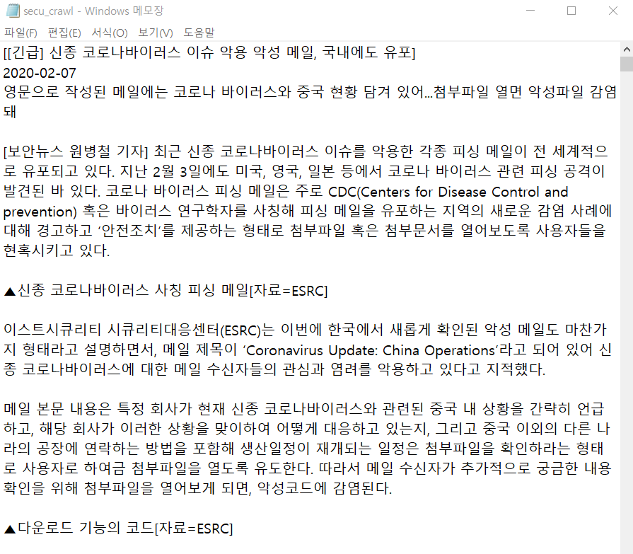 보안뉴스 기사 크롤링 결과는 아래와 같다.