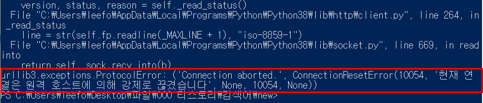 그리고, 위에서 구한 첫 인덱스부터 시작하도록 news_url을 구성해주고 Selenium webdriver를 사용해 url에 접근하기 전, 끊김 방지를 위해 sleep을 5정도로 준다. 처음에 sleep을 안줬었는데 계속 아래와 같이 'Connection ResetError 현재 연결은 원격 호스트에 의해 강제로 끊겼습니다.' 와 같은 에러가 발생하면서 중간에 강제로 끊겨서 구글링해봤는데 sleep으로 해결이 가능했다.