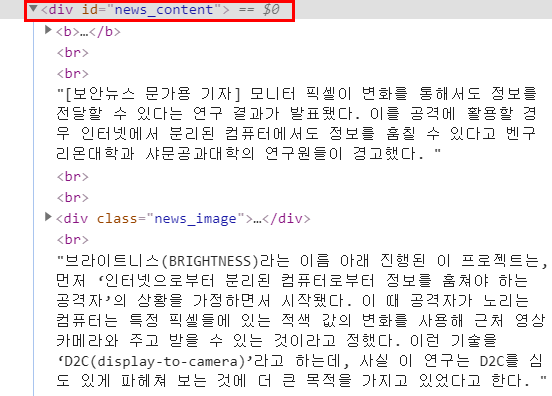 그리고 뉴스 기사 본문은 div 태그의 "news_content" id에 저장되어 있다. 이것 또한 find_element_by_id로 접근해준다.