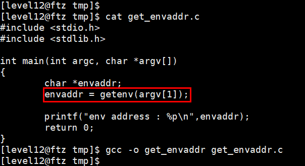 그렇다면, 이번 문제에선 환경변수에 쉘코드를 등록하는 방법을 사용해보자. 먼저, 등록한 환경변수를 리턴주소로 입력하려면 환경변수의 주소를 알아야하기 때문에 간단히 get_envaddr.c 를 작성하고 컴파일해준다.