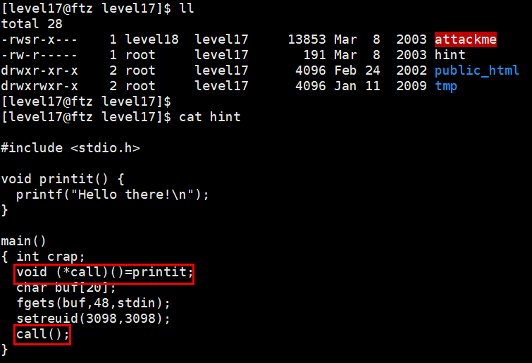 FTZ level16과 비슷해보이지만 하나 다른 점은 이번엔 shell() 없다는 것이다. shell() 함수 없이 call 함수 포인터 변수의 주소값을 어떠한 값으로 덮어써 쉘이 실행되게만 하면 된다.