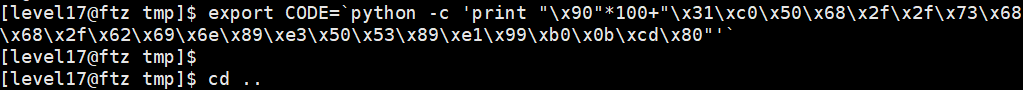 level17 풀이는 간단하다. 몇번 환경변수를 사용한 적이 있는데 환경변수에 쉘코드를 등록하고 환경변수의 주소를 덮어써주면 되는 것이다.