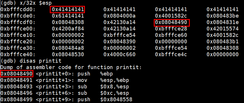 입력해준 41414141 버퍼 시작부터 printit 함수 시작 주소까지 거리가 40이기 때문에 첫번째 dummy 값이 20임을 알 수 있다.