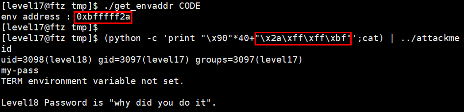 그럼, 아래와 같이 FTZ level18로 가는 쉘과 비밀번호를 획득하게 된다.