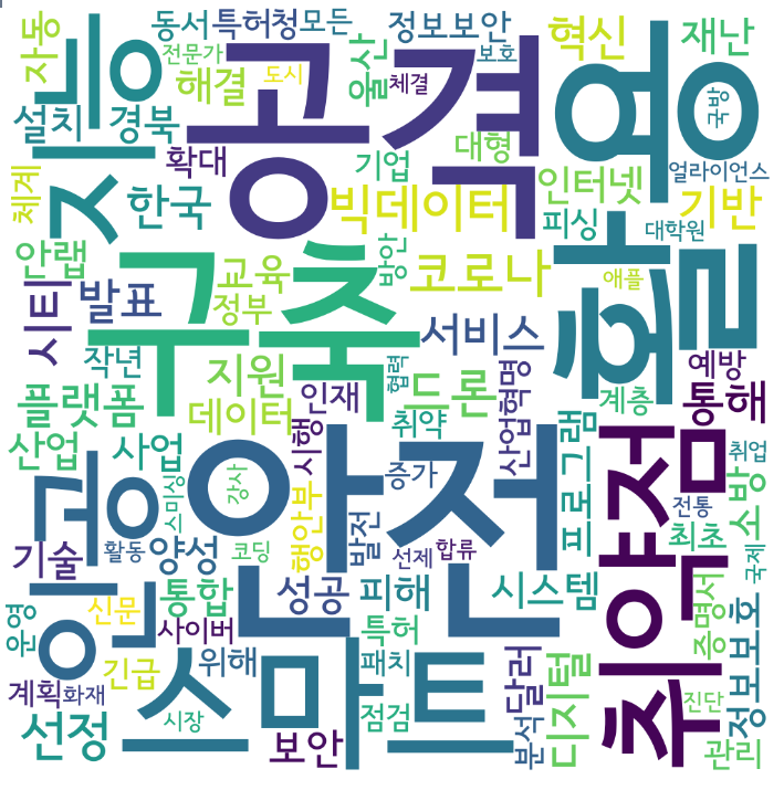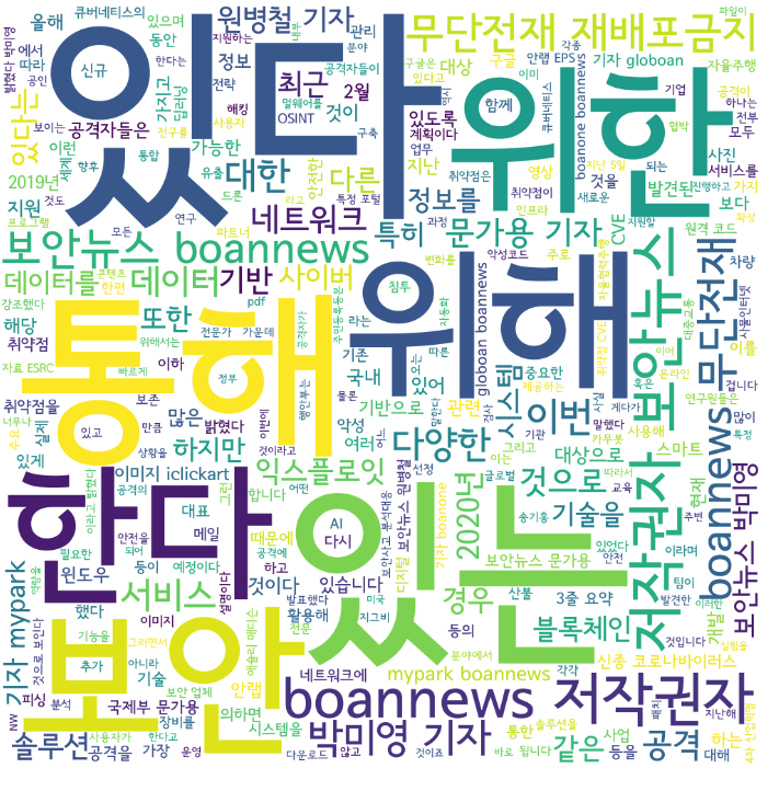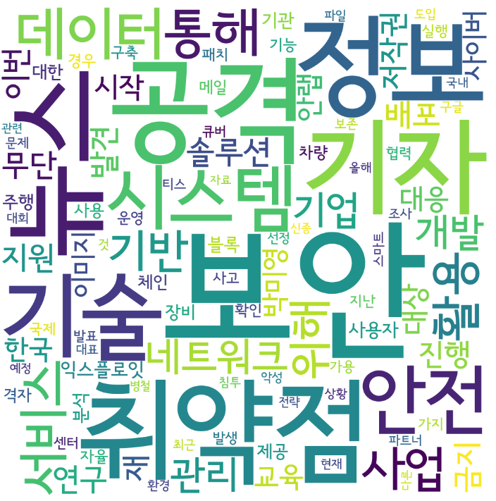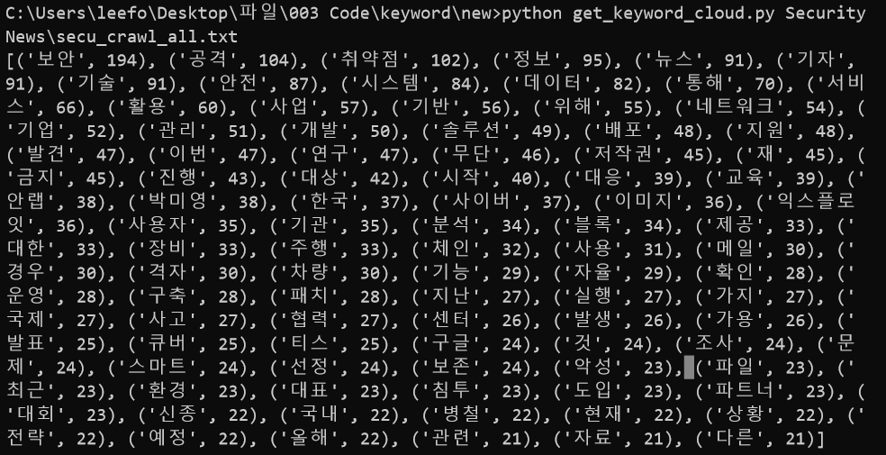 여기서 한가지 더, TMI를 서술하자면... 계속 뉴스기사 전문을 크롤링한 텍스트를 사용했는데 아무래도 그러다보니 '보안', '뉴스', '기자'와 같은 일반적인 단어들이 많이 포함되는 것 같다. 그래서 이번엔, 뉴스 제목만 크롤링해서 시각화해보기로 했다.