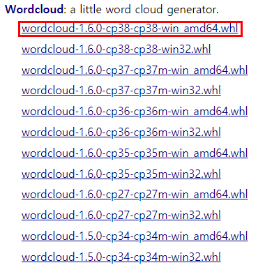 나는 파이썬 3.8에 윈도우10 x64를 쓰기 때문에 제일 위에 있는 wordcloud-16wordcloud‑1.6.0‑cp38‑cp38-win_amd64.whl 파일을 다운받아주었다.