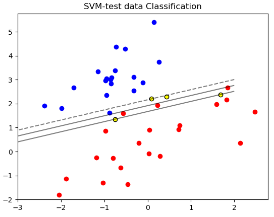 위에서 분류 목적의 데이터셋과 시각화를 위한 총 3개의 선(X,Y,Z) 그리고 서포트 벡터를 plot해주었다. 그 결과는 아래와 같은데 여기서 노란색으로 표시된 데이터가 서포트 벡터이다.