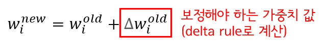 그리고 그 결과값 f(net)이 목표(정답)값과 오차가 얼마나 되는지 계산한 후 이 오차를 줄이기 위한 변화율(아래 빨간 네모 박스)을 계산해 가중치값을 w_old에서 w_new로 업데이트하는 것이다. 그리고 허용오차 범위 내로 들어올 때까지 이 과정을 계속 반복한다.