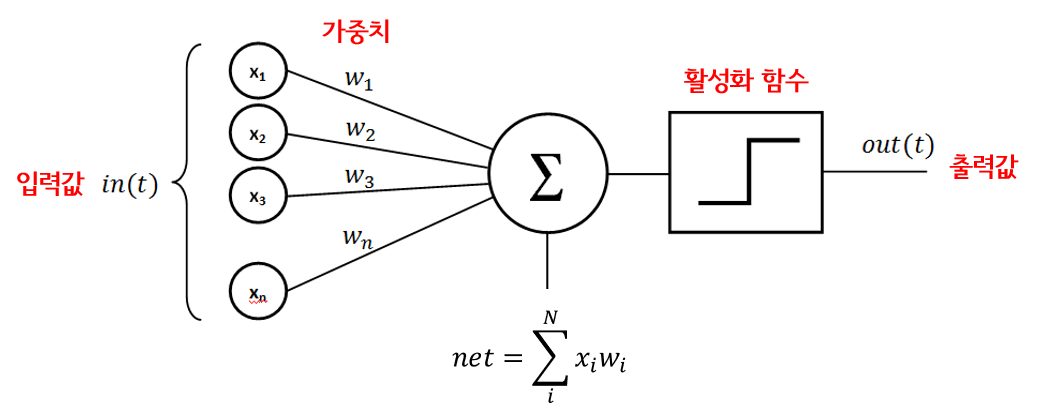 아래 그림을 보면, 입력값들이 가중치를 부여받고 net 함수와 활성화 함수를 거쳐 출력값으로 나오는 모습을 볼 수 있다.