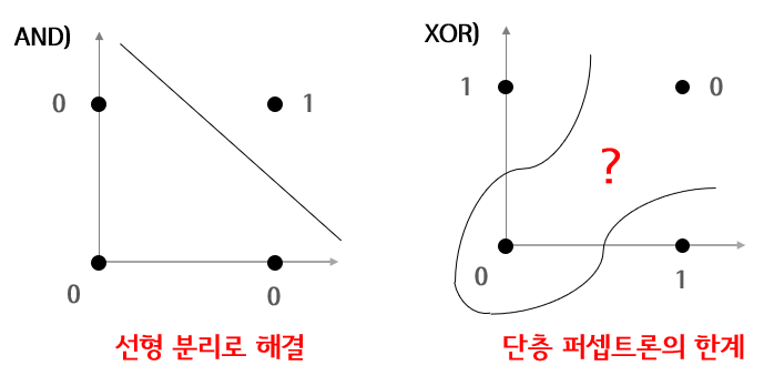 아래 그림에서 보이다시피 AND 연산의 경우 선형 분리로 해결이 가능하지만 XOR 연산으로만 가도 분류를 못하게 된다는 한계가 있는 것이다. 물론 옛날이긴 하지만 이렇게 인공지능에는 1차 겨울이 오게 된다...