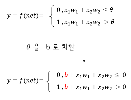 위에서 본 식에서 처음보는 임계값이 등장했는데 이 임계값은 결국 아래 식에서 보는 것과 같이 바이어스로 치환된다. 가중치는 각 입력값이 출력값에 주는 영향력을 조절하는 변수라면 바이어스는 뉴런이 얼마나 쉽게 활성화되느냐 (아래의 예시에서는 얼마나 쉽게 결과를 1로 출력하느냐)를 조절하는 변수이다.