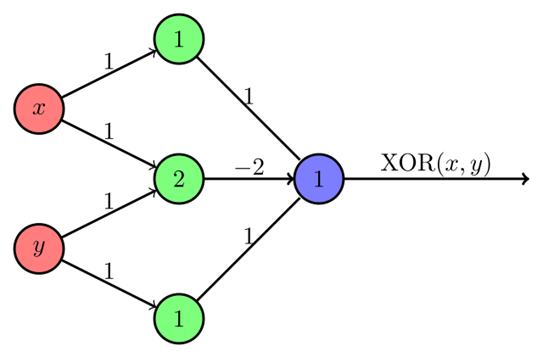 그렇다면 왜 다층퍼셉트론이 선형 분리의 한계점을 해결했다는 것일까? XOR 문제를 예로 들어보자. XOR 문제는 선형 분리로는 해결할 수 없었지만 연두색의 은닉층이 추가됨으로써 아래와 같이 XOR 문제를 해결할 수 있게 된다.