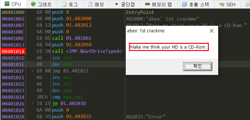 아래 캡쳐처럼 두 레지스터가 동일하게됐고 'Ok, I really think that your HD is a CD_ROM! :p'이라는 창을 볼 수 있게된다. 참고로 401005에서 401000은 imagebase이기 때문에 정답은 5가 맞다.