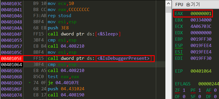 IsDebuggerPresent 함수 호출 부분으로 가서 직접 반환값을 확인해보자. 호출 후 EAX를 확인하니 1이다. 위에서 0인 경우를 확인하고 있었으니 디버깅 중인 경우에는 반환값이 1이고 아닌 경우에는 0인 모양이다.