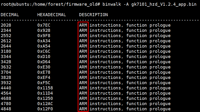 펌웨어 아키텍쳐를 식별하고 싶으면 -A 옵션을 주면 된다. gk7101_hzd_V1.2.4-app.bin 펌웨어의 아키텍쳐는 ARM인 것을 알 수 있다.