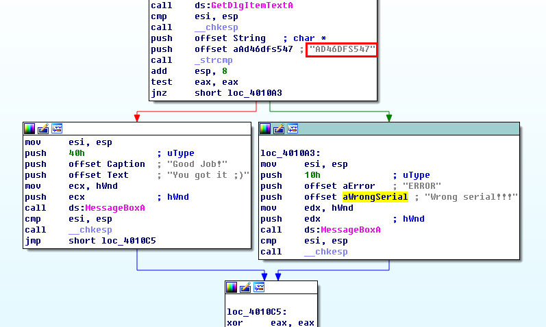 해당 string 사용 위치로 가보니, 시리얼이 맞았을 때와 아닐때의 분기가 나뉘는 부분을 찾을 수 있다. 그리고 그 위쪽에 strcmp로 문자열 비교를 하는 부분이 있기 때문에 네모박스 친 문자열이 시리얼임을 유추할 수 있다.