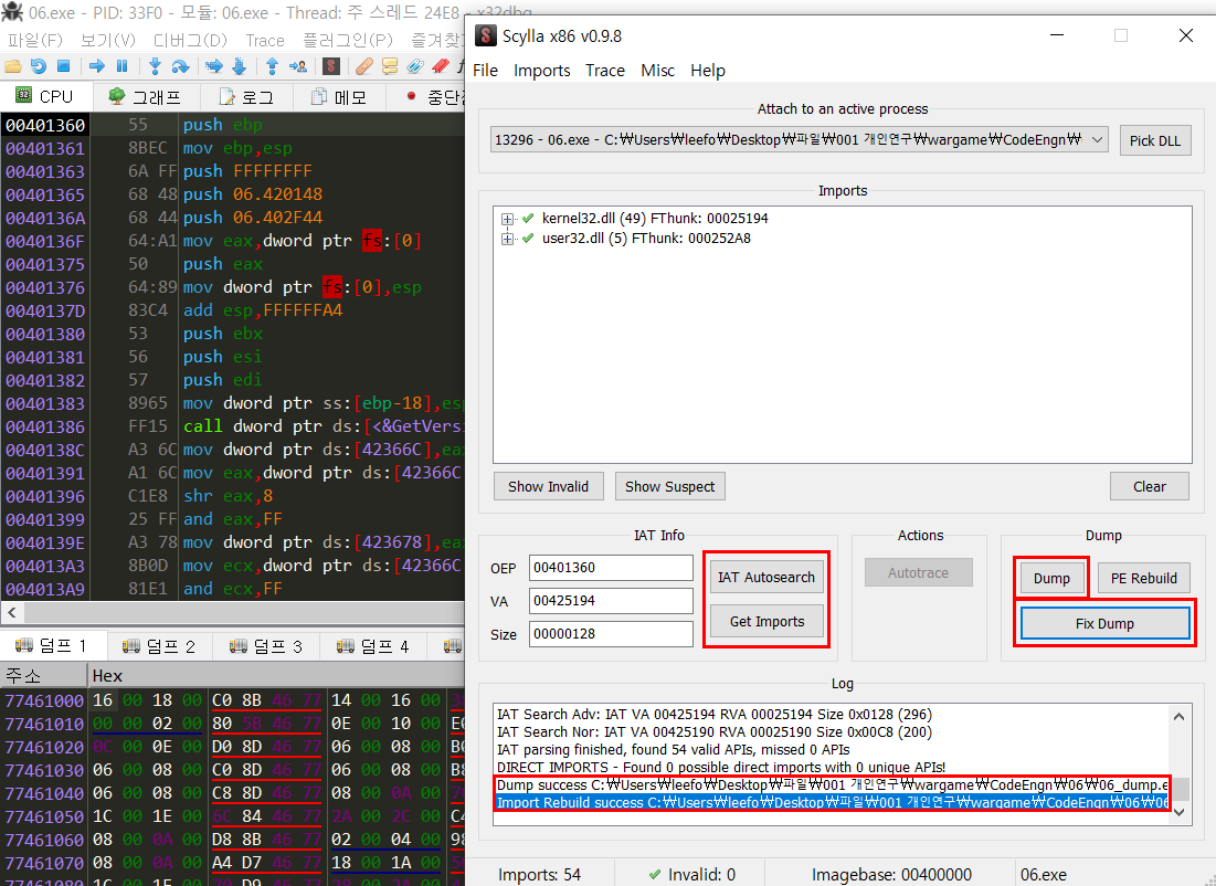 이렇게 OEP를 찾을 수 있다. 수동으로 언팩을 하려면 OEP, IAT, Imports를 맞춰주어야 하는데 다행히도 X32Dbg에는 플러그인 Scylla가 그 기능을 제공한다. IAT Autosearch와 Get Imports로 필요한 정보들을 찾아놓고 Dump를 눌러 파일 덤프를 먼저 떠놓는다. 그리고 Fix Dump를 눌러 찾은 IAT와 Imports 정보를 맞춰준다.