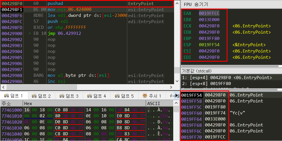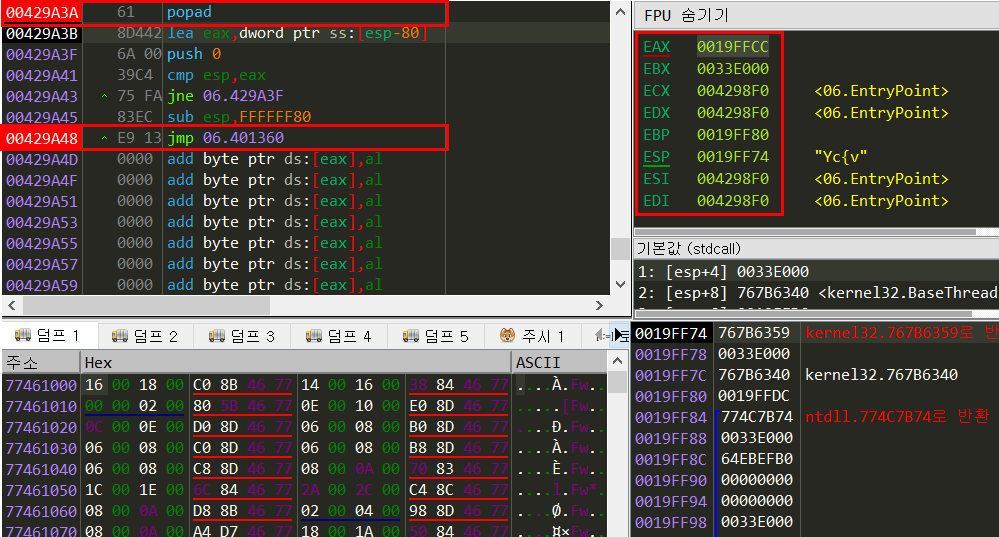 그리고 아래와 같이 명령어 찾기로 popad를 찾아주고 실행시켜보면, 백업해두었던 스택의 레지스터 값들이 전부 복원된 것을 볼 수 있다. 그리고 그 밑에 jmp에 bp를 걸어주고 실행시킨 후 jmp하는 위치로 가보자.