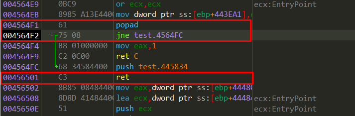중단된 곳은 아래의 popad 부분이다. 바로 밑에서 jne로 점프 후 445834로 리턴하고 있다.
