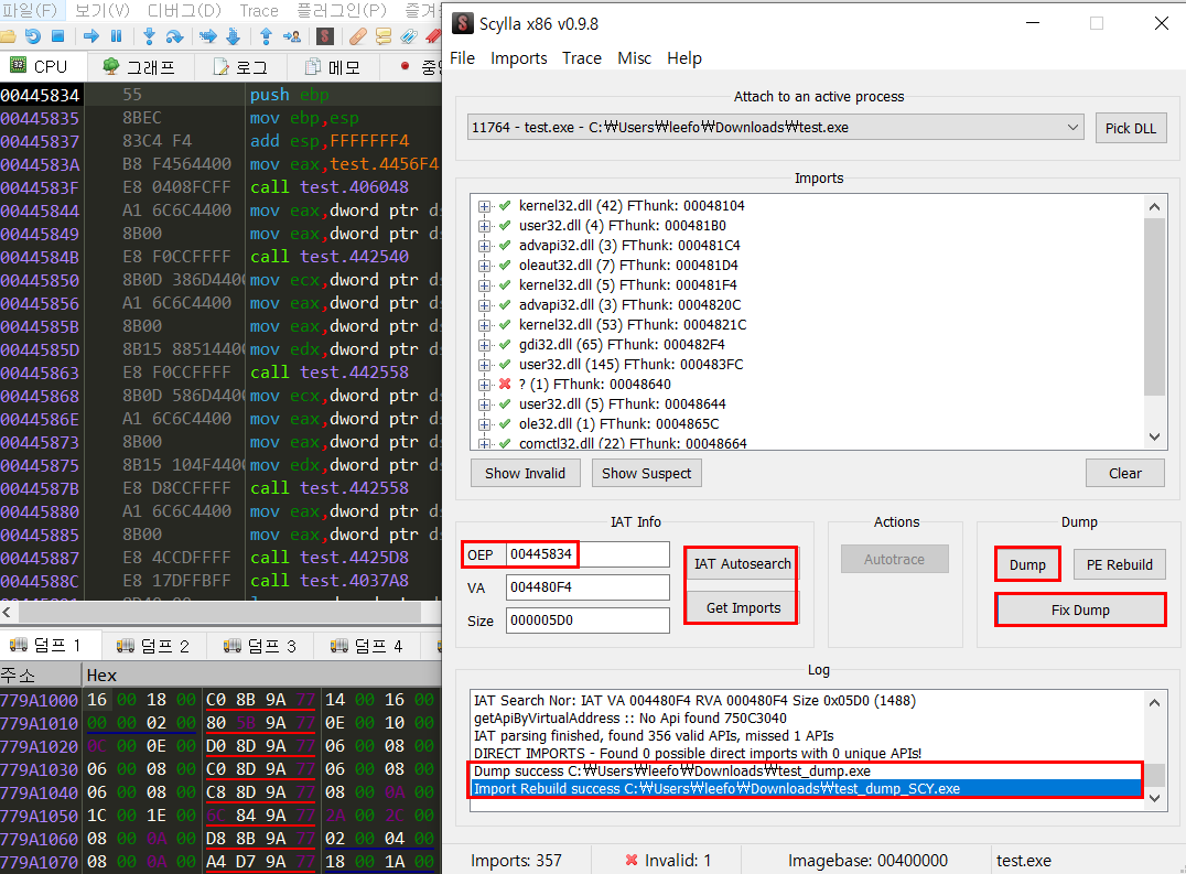 해당 부분이 OEP가 맞는지 덤프를 떠보자. x32Dbg의 내장 툴인 Scylla를 사용해 IAT 정보를 자동으로 찾아준 후 덤프를 떠주었다.