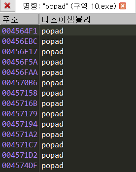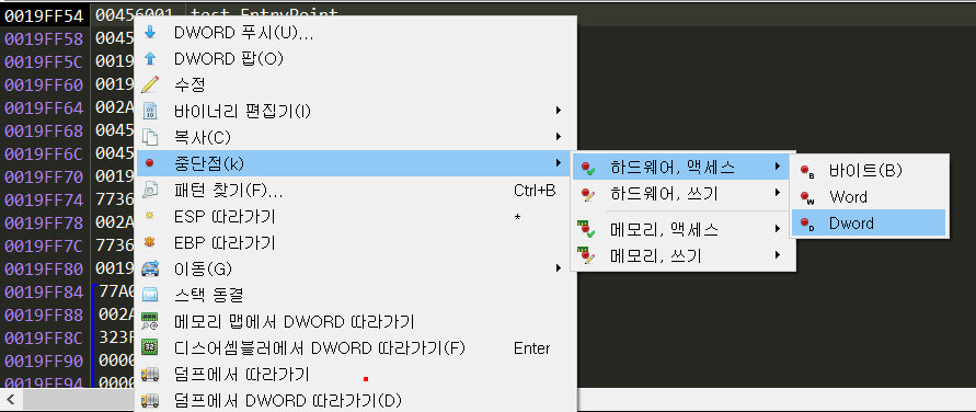 그다음 popad에 bp를 걸여주려 했는데 한개가 아니라서.. 스택에 하드웨어 bp를 걸기로 했다.