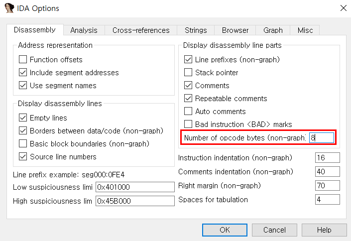 참고로, IDA에서 옵코드를 확인하려면 Options>General을 클릭 후 아래의 'Number of opcode bytes' 부분을 원하는 크기로 변경해주면 된다.