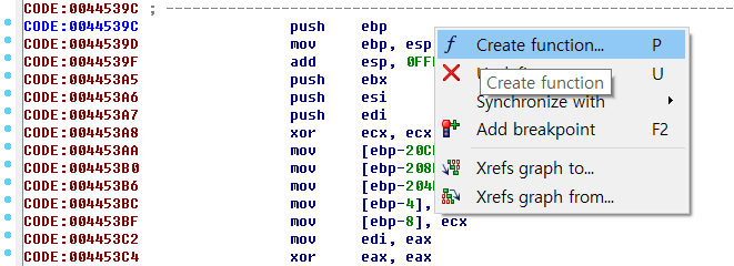 참고로 위에처럼 빨간색으로 뜨는 건 함수 지정이 제대로 되지 않아서 그렇다. 이런 경우 함수 시작 프롤로그 부분에서 마우스 우클릭을 한 후 'Create Function'을 해주면 된다.
