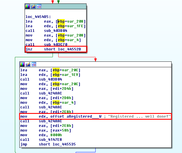 시리얼처럼 생긴 문자열 위치로 가보니 밑에 "Registered..."라는 등록 성공과 관련한 문자열이 보인다. 해당 문자열이 사용되는 함수로 가보았다.