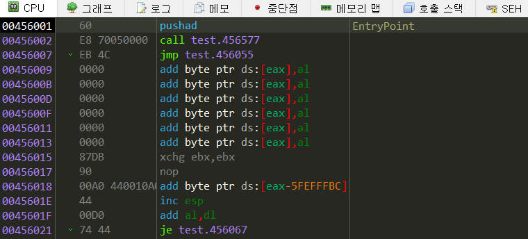 여태까지 UPX 패킹만 나왔는데 이번엔 ASPack이 나왔다. 하지만 UPX이던 ASPack이던 간단한 패커이기 때문에 레지스터 백업과 복원의 위치에서 OEP로 뛰는 부분만 잘 찾아주면 된다.