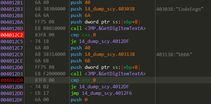 순서대로일것 같긴 하지만 어떤 것이 첫번째 입력값이고 두번째 입력값인지 확인해보기 위해 입력값을 받는 부분에 bp를 걸고 실행시켜보았다. 문제에서 Name은 CodeEngn일때라고 가정하고 있으므로 첫번째 입력칸에는 CodeEngn을 넘겨주었다.