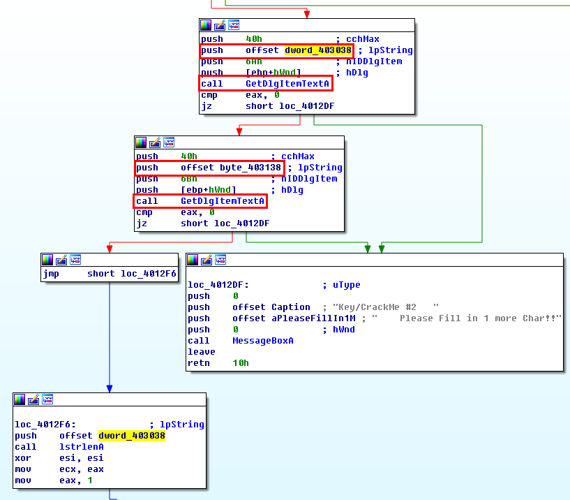 해당 함수에는 아래와 같이 GetDigItemTextA로 총 두번의 입력 string을 받고 있으니 첫번째는 name 부분이고 두번째는 시리얼을 입력받는 부분일 것이다. 그리고 입력받은 string은 각각 403038과 403138에 저장된다.