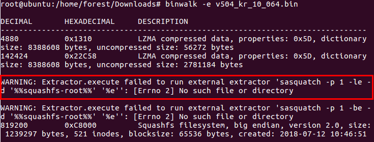 binwalk를 사용해 펌웨어를 추출하다 보면 가끔 " WARNING: Extractor.execute failed to run external extractor 'sasquatch -p 1 -le -d '%%squashfs-root%%' '%e'': [Errno 2] No such file or directory " 와 같은 에러가 발생할 때가 있다. 아마도 squashfs 파일시스템과 관련해서만 발생하는 에러인 것 같다.