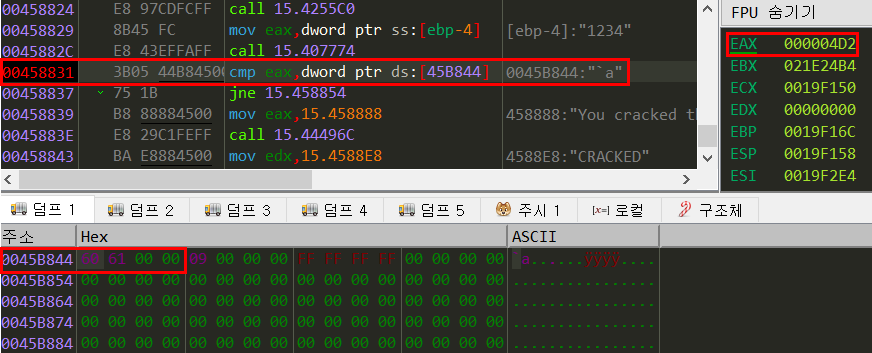 eax에 1234(0x4D2)가 들어가있으므로 ds:[45B844] 값인 0x6160이 시리얼이 된다.