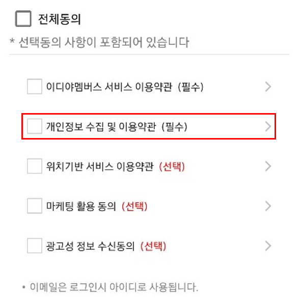 아래 이디야 멤버스 앱을 예시로 들어보자. (참고로 이디야는 아무 잘못이 없다. 그냥 가입할때 이용동의 체크받는 앱 생각했는데 갑자기 이디야가 생각났다.) 필수적으로 '개인정보 수집 및 이용약관'을 동의하도록 되어있다.