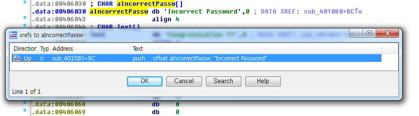 먼저, 정답 체크를 수행하는 함수에서 쓰일 것 같은 문자열 "Incorrect Password"가 쓰이는 함수를 찾았다.
