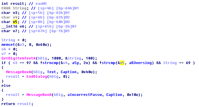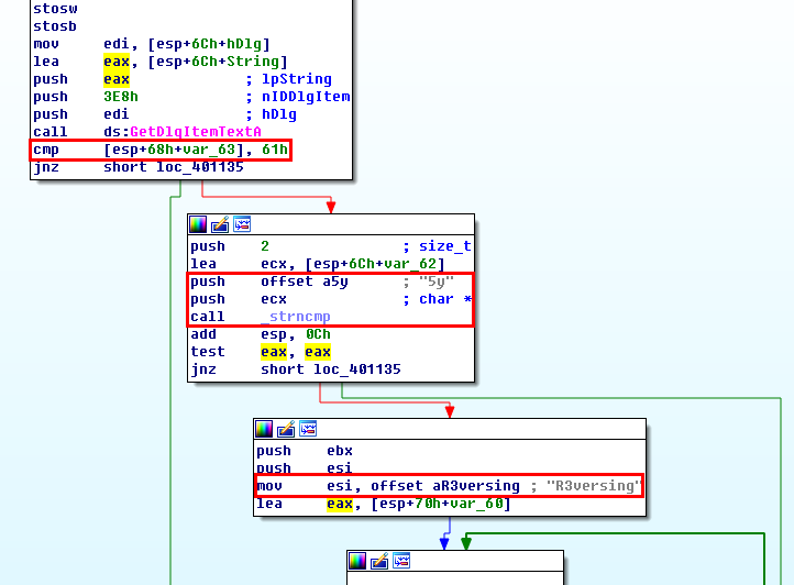 정확한 것은 실행을 좀 해봐야 알겠지만, 대략 위에서부터 살펴보면, GetDigiItemTextA로 입력한 시리얼 값을 가져와 그 중 ??? 부분이 0x61('a')인지 cmp로 비교하고 있고 'a'일 경우 strncmp로 ??? 부분이 5y인지 확인하고 있다. 그리고 바로 뒤에 R3versing이 나오는데 이 부분은 헥스레이로 확인해주었다.