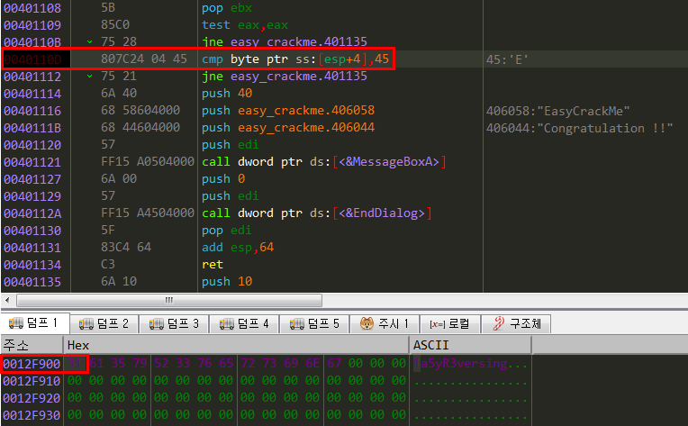 그럼 아직 ??? 부분을 모르므로 처음에 "123456789abcdefg"를 주고 실행시켜서 확인해보면 "1a5yR3versing" 까지는 완성된다. 그리고 아래와 같이 마지막 비교구문을 확인할 수 있는데 ss:[esp+4]가 0x45인지 확인하고 있다. [esp+4]는 덤프창에서 확인해보면 31이므로 첫번째 입력값이 'E'여야 하는 것을 알 수 있다.