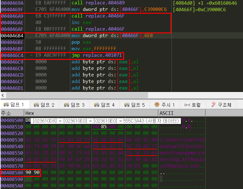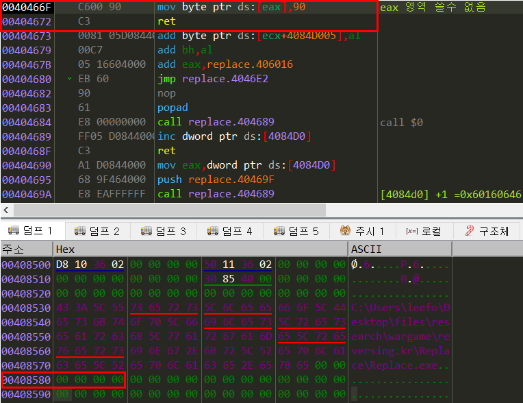 40466f로 들어가보면, eax=입력값+(0x4)+(0x601605C7) 인데 여기에 0x90을 쓰고있다. 그럼 우리가 입력값을 줘서 바꿀 수 있는 부분은 0x90을 쓰는 주소인 것이다.