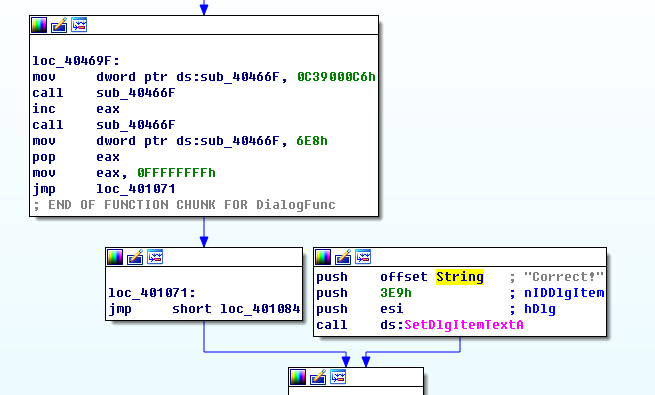 0x90을 쓰는 행위를 하는 함수 40466f는 두번 실행되기 때문에 결국 0x9090이 써지고 2번째 jmp문인 401071로 점프하게 된다. 어차피 401071로 점프하기 때문에 eax값은 401071이 되면 된다. 그러면 입력값+~~~=401071=eax가 되면 여기에 nop이 써질 것이고 jmp가 무효화가 되고 Correct가 나오는 코드가 실행될 것이기 때문이다.